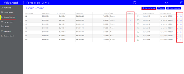 Nella tile "Fatture Ricevute” del Portale dei Servizi è possibile visualizzare tutte le fatture passive che il Sistema di Interscambio (SDI) ha recapitato in quest’area grazie al codice destinatario Bluenext.